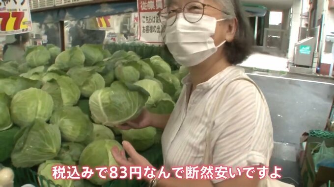 「卵1パック83円です。こちらのキャベツも1個83円です」