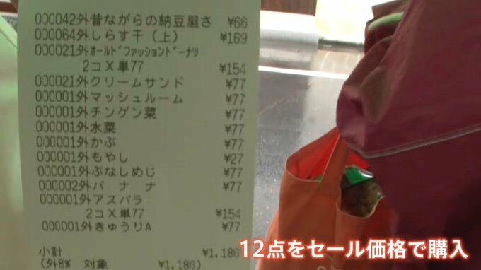 「今日は77円セールなので基本的に77円(税抜き)とか安いものしか買わない」