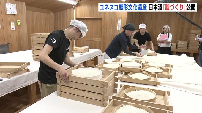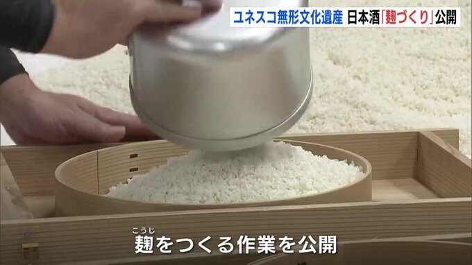 日本の「伝統的酒造り」のユネスコ無形文化遺産登録決定に合わせて、広島県の酒どころ東広島市で、麹をつくる作業が公開されました。