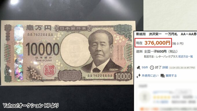 さすがに数百万円とまではいきませんが、直近の例ですと、2024年11月24日のYahoo!オークションにて、7月に発行されたばかりの新紙幣、渋沢栄一の1万円札が37万6000円で落札されているのが確認できます。