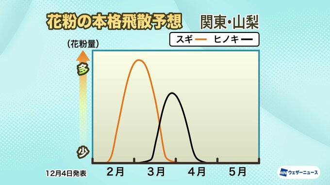 12月の気温は寒気の影響を受けることで平年並みとなり、飛散時期に影響が大きい1月から2月の気温は平年より高くなる予想で、寒さが緩むタイミングでスギ花粉が飛び始めます。