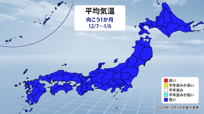 向こう1か月の平均気温は、全国的に平年よりも低くなる予想です。上空約1500メートル付近の気温が東・西日本を中心に平年より低くなるため、寒気の影響を受けやすくなることが要因です。年末年始も平年より寒くなりそうです。
