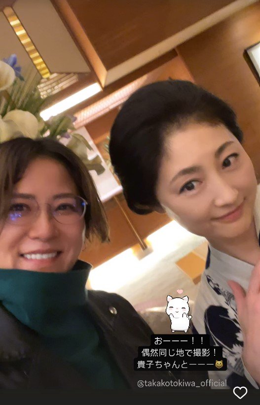 鈴木砂羽さんは、インスタグラムのストーリー機能で「おーーー!!偶然同じ地で撮影!貴子ちゃんーーー」と、2ショット写真をアップ。