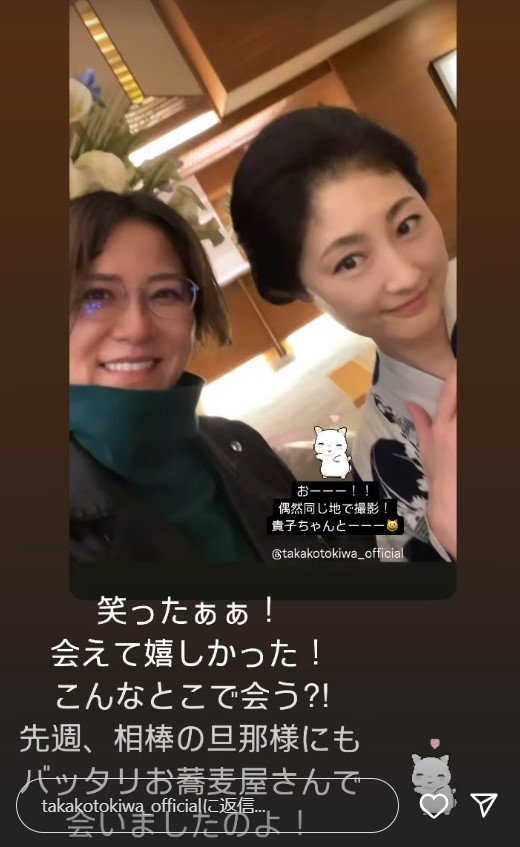 続けて「先週、相棒の旦那様にもバッタリおそば屋さんで会いましたのよ!」と、ドラマ「相棒」シリーズで、鈴木砂羽さんと夫婦役を演じている、俳優の寺脇康文さんともバッタリ遭遇していたことを明かしました。