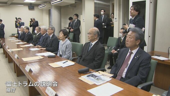 富士山登山鉄道構想に賛同していた団体に山梨県の長崎幸太郎知事は方針転換した新たな交通システム「富士トラム」について説明しました。