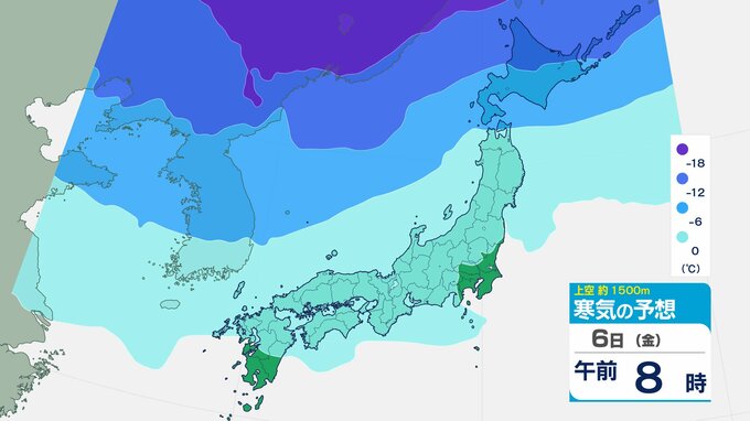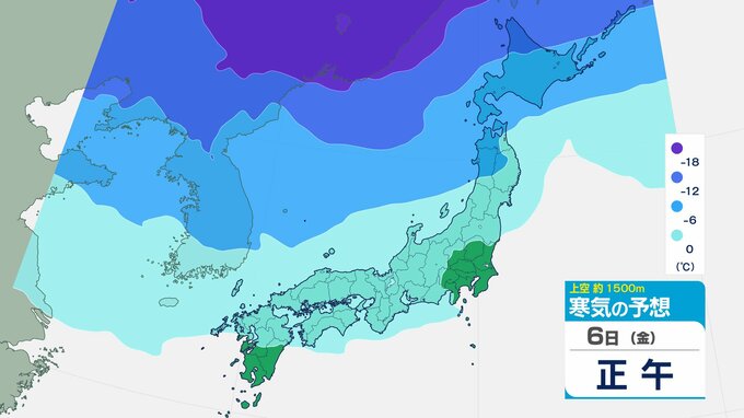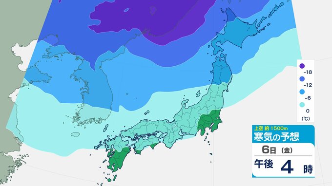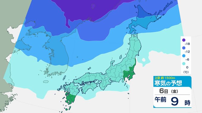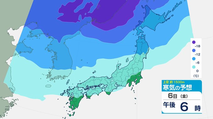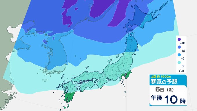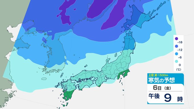 今週末は北海道~北陸で強い降雪…通行止めなど交通への影響のおそれ【上空の寒気シミュレーション】最新情報に注意を【2週間天気】 チューリップテレビ 2024年12月6日(金) 07:00 国内 天気 寒気の流入シミュレーション 6日(金)