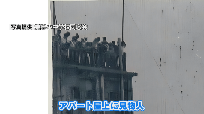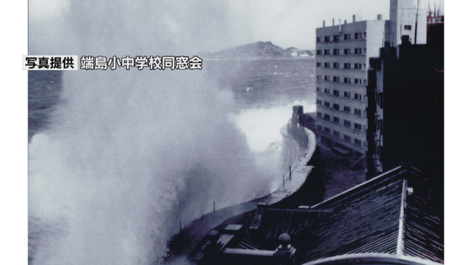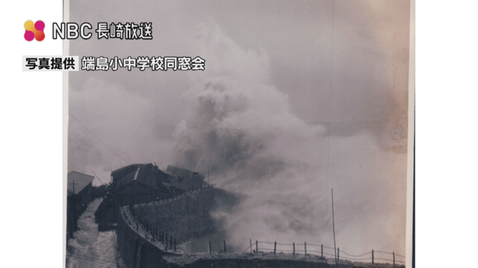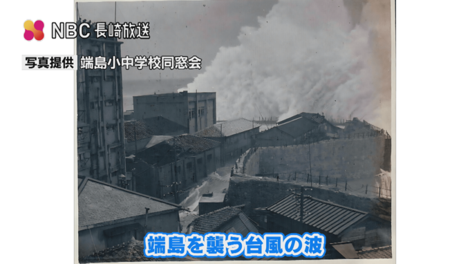 古い写真を分析することで時間旅行を体験する「写真でタイムマシーン」。今回は端島=軍艦島を襲う台風の貴重な写真です。「端島小中学校同窓会」より画像の提供をいただきました。「画像付きで読む」で読んでください。