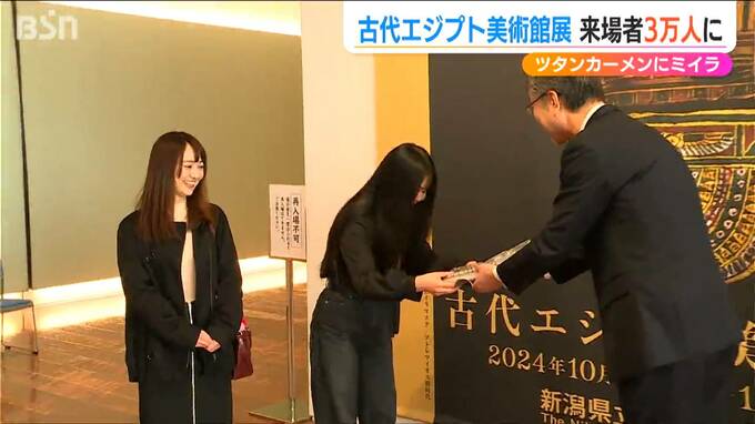 ツタンカーメンの指輪やミイラマスクなどおよそ200点が展示されている県立万代島美術館で開催中の『古代エジプト美術館展』。3万人目の来場者は新潟市秋葉区から訪れた親子です。