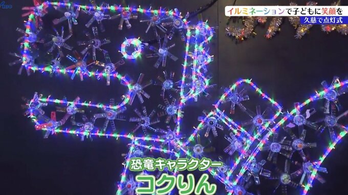 イルミネーションの中でも放課後こども教室の児童がペットボトルで作った、小久慈地域の恐竜キャラクター「コクりん」が光り輝くと、一気に笑顔が弾けました。