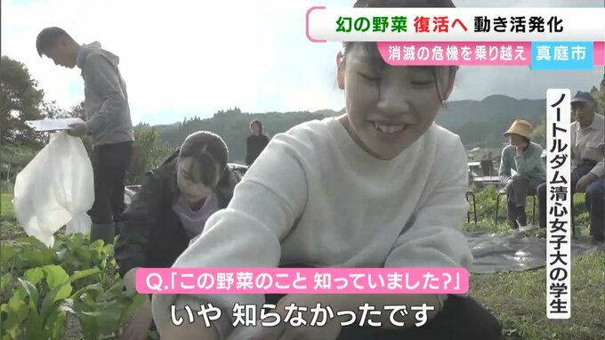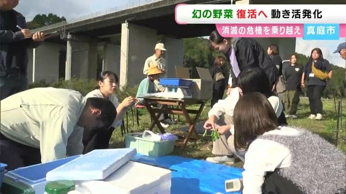 ノートルダム清心女子大学の食品栄養学科の学生たちです。岡山県が実施する、地域活性化事業の一環で、学生たちは二川地域に通い、地域の人たちと一緒に土居分小菜を育てているのです。