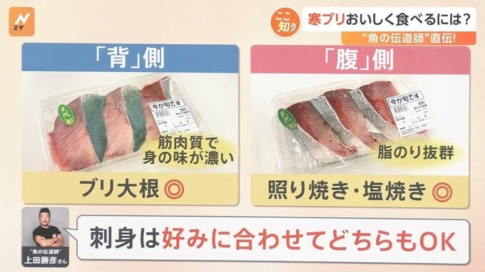 ブリをスーパーで買うとき、背側は筋肉質で身の味が濃いので「ブリ大根」がいいそうです。煮物だと油が多すぎて中に染み出過ぎてしまうので、「ブリ大根」がいいということでした。