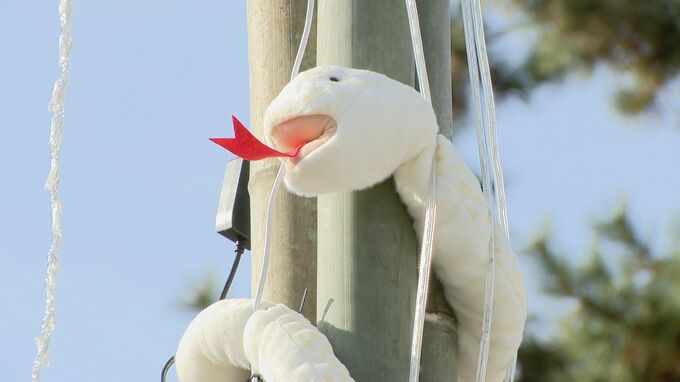 高さ10メートルの「門松リー」は名古屋市の建設会社「中部土木」が4年前から毎年設置していて、ツリーには来年の干支ヘビや竹をのぼるサンタクロースがあしらわれました。
