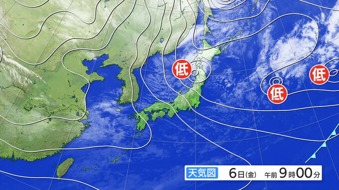 6日午前9時の天気図です。東北の西の日本海にある低気圧は東へと進む見込みです。