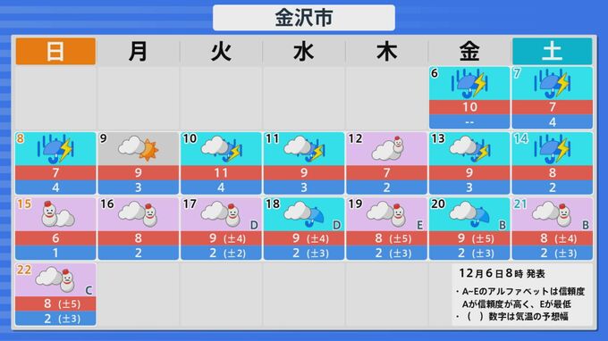 雨や雪のマークがほとんどで、本格的な「冬モード」に突入しています。金沢では今シーズンの初雪はまだですが、8日の上空や地上の気温の状況によっては、発達した雲から雪がもたらされるかもしれません。