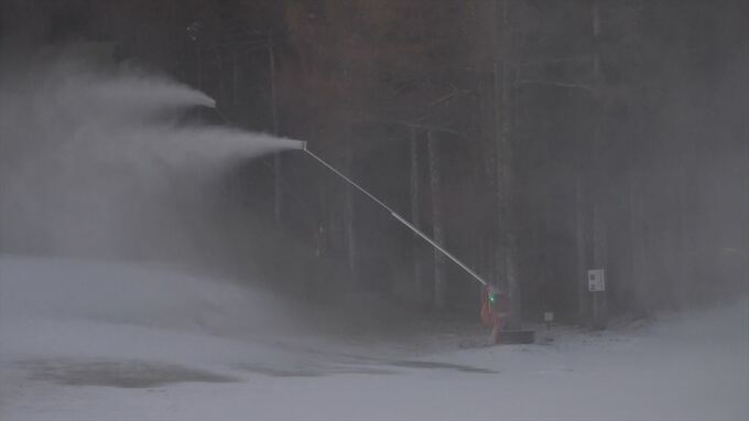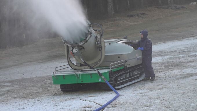 今シーズンは5日の午後11時頃から作業が始まり、従業員が人工降雪機や備え付けの「ローエアガン」という機械を使ってゲレンデに雪を降らせていました。