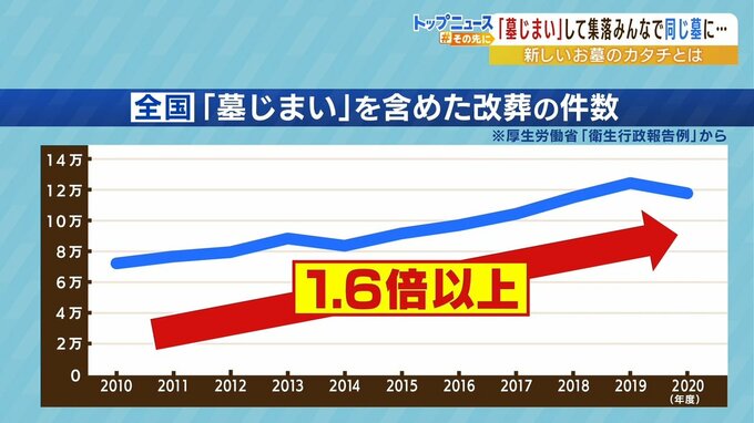 お墓の維持の難しさは全国的に顕在化していて、厚生労働省の調査(衛生行政報告例)によりますと、墓じまいを含む遺骨を別の場所に移す「改葬」は10年前に比べて1.6倍以上になっています。