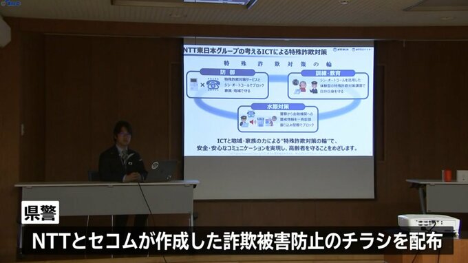 県警は今後NTTとセコムが作成した詐欺被害の防止を呼び掛けるチラシを配るなどして地域の安全・安心の確保に向けて連携します。