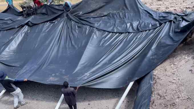 重いシートを工夫しながら動かしていきます。石を入れる作業から先は現地のスタッフに任せて、今回の作業を終えることになりました。