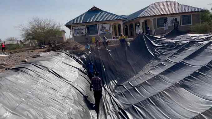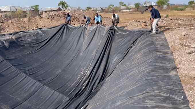 今回、現地のスタッフには福岡から持ってきたそうめんを振る舞いました。恐る恐る口にします。ナイロビから調達した遮水シートをみんなで運び、掘削したところへ張っていく作業です。