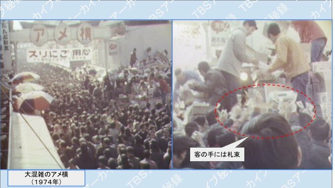 東京を代表する商店街アメヤ横町(通称:アメ横)。1974年(昭和49年)の年末の映像がありました。食品を中心とした商品を格安で扱っているアメ横。特に年末年始の混雑は有名で、おせちの材料を求めて、どこを見ても人・人・人。
