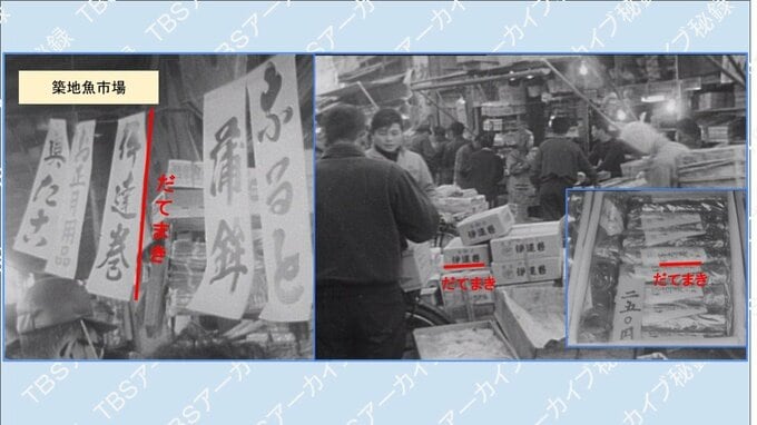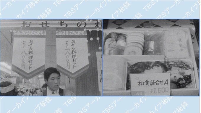TBSのアーカイブに残されているおせち関連で一番古い映像は1961年12月31日の買い出し客で賑わう東京・築地魚市場。伊達巻やかまぼこなど、おせちの材料を買い求める客でごった返していました。