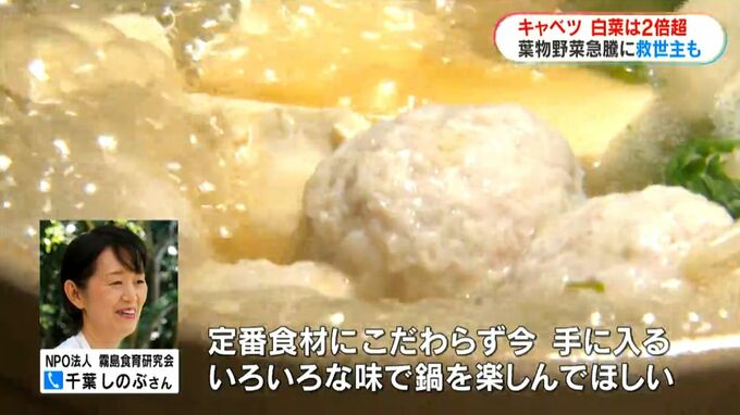 (記者)「お鍋に欠かせない白菜。去年は1玉298円だったが、今年は100円ほど値上がりしている」