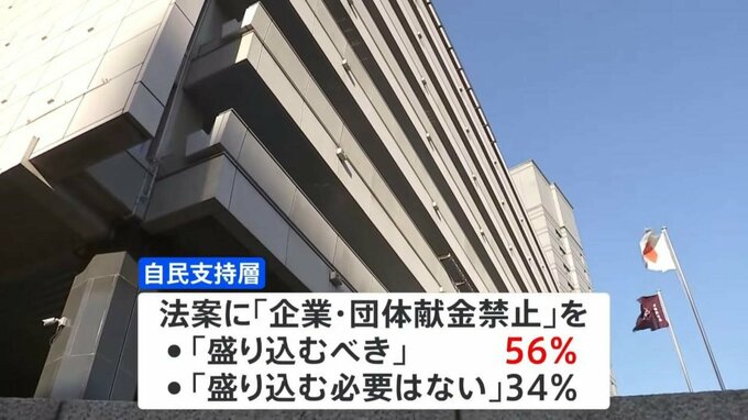 法案に企業・団体献金禁止を「盛りこむべき」との世論は6割を超える。自民党層に限っても56%となっていて、企業献金をめぐる国民の理解は広がっていない。