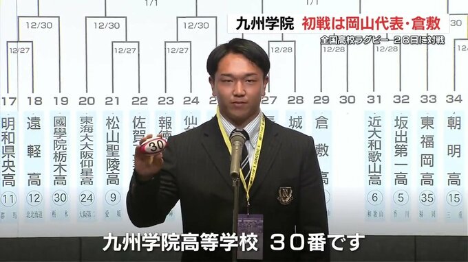 12月27日に開幕する全国高校ラグビー大会の組み合わせ抽選会が大阪府で行われ、熊本代表の九州学院は、岡山代表の倉敷と対戦することになりました。今月27日に開幕する全国高校ラグビー大会。2大会連続で花園出場…