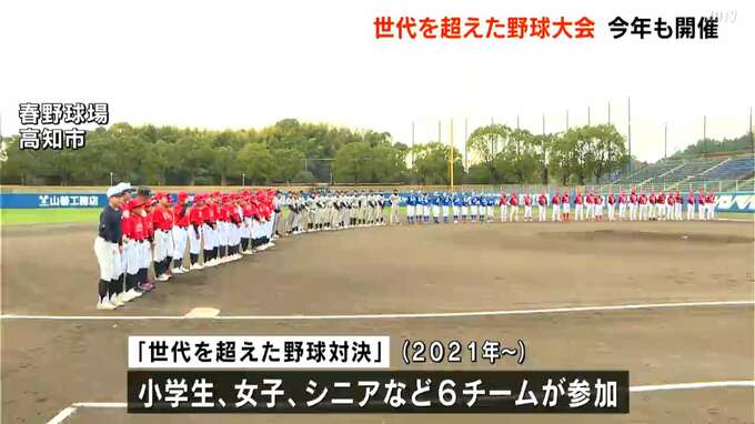 老若男女さまざまな野球チームが対戦する「世代を超えた野球対決」が今年も行われました。このイベントは、高知の野球界を活気づけようと2021年から行われていて、今年は、小学生、女子、シニアなど6チームが参加…