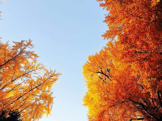 投稿された写真では、爽やかな青空と、紅葉で色づいた木々の、美しいコントラストが見て取れます。