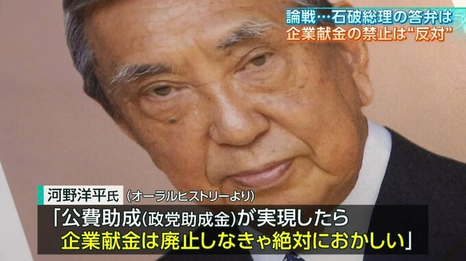 「5年後に見直しという条件で、企業献金を廃止することで合意できた。公費助成(政党助成金)が実現したら企業献金は廃止しなきゃ絶対におかしい」