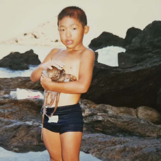 続けて「タコを捕まえて喜んでた少年中岡が 47歳の中年中岡になりました!」と、少年時の中岡さんが、タコを捕まえている画像をアップしました。