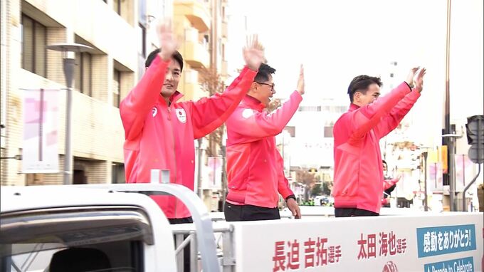 パレードは、パリ五輪・体操男子で3冠に輝いた岡山市出身の岡慎之助選手、パラリンピックの陸上で銀メダルと銅メダルを持ち帰った岡山市に住む佐藤友祈選手、パラリンピックリレーの生馬知季選手、アーチェリーの中西絢哉選手、それに自転車トラックレースの太田海也選手と長迫吉拓選手の6人の選手を称えて行われました。