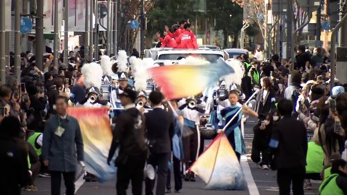 選手たちは、歓声に包まれながら、岡山市中心部をラッピングされた車でおよそ40分かけて回りました。
