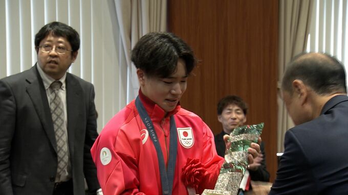 日本人最多、日本体操界にとっても52年ぶりの快挙となる3個の金メダルを持ち帰った偉業を称えるもので、岡選手は、4年後のロス五輪に向け、さらなる活躍を誓っていました。