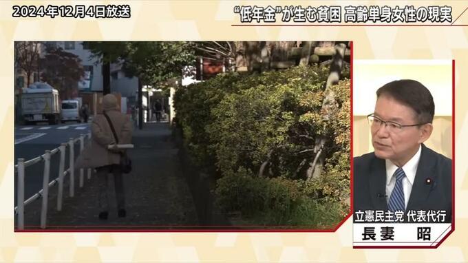 「深刻なのは団塊ジュニアの女性50~53歳の方々。非正規比率も高いし、就職氷河期で全体的に賃金も低いし未婚率も高い。そういった方々が2040年ごろ老後を迎えた時に生活ができなくなる。間違いなく今のままだとそうなる。(中略)我々は『上乗せ年金』の創設が必要だと…。一定の(低い)年金の方に税金で上乗せする。イギリスでもPension Credit、ドイツでは基礎保障、フランスでは連帯保証といって年金が少ない方に上乗せする制度がある。民主党政権の時に『年金生活者支援金』(財源には4~5000億…)という制度を作った。これを拡充して…」
