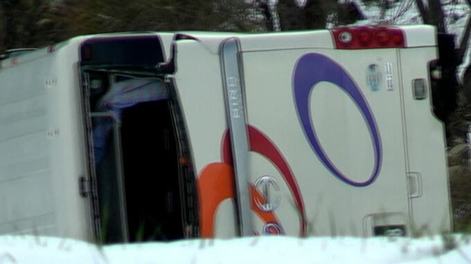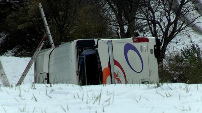 けさ(9日)、岡山県真庭市の市道で大型の観光バスが横転しました。乗客11人がけがをしています。