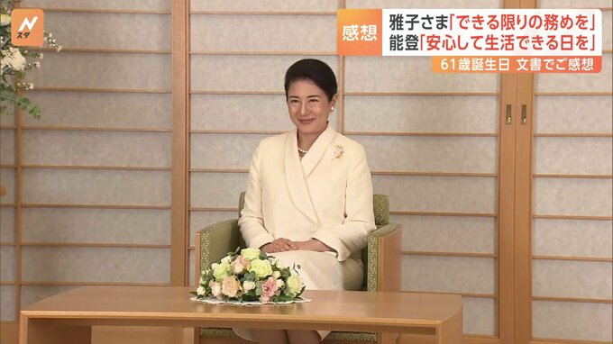 きょう、61歳の誕生日を迎えられた皇后・雅子さま。文書で感想を寄せ、この1年を振り返るとともに「できる限りの務めを果たしていくよう努力したい」と記されました。上皇ご夫妻のお住まいの仙洞御所に誕生日のあ…