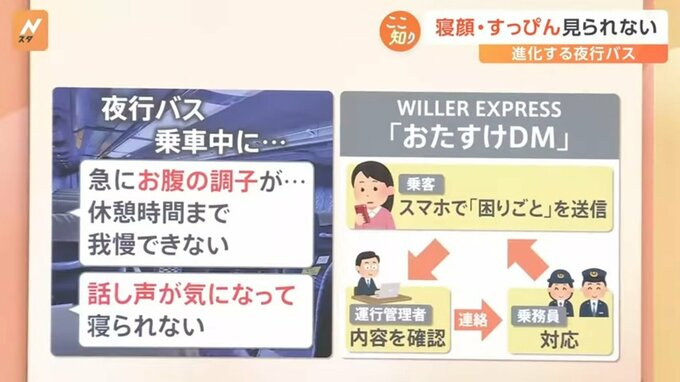 夜行バス乗車中に「急にお腹の調子が…休憩時間まで我慢できない」「話し声が気になって寝られない」といったことにも対応するサービスがあります。