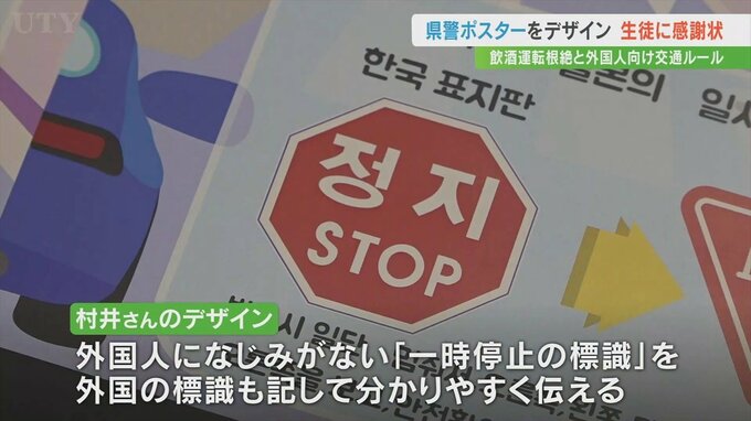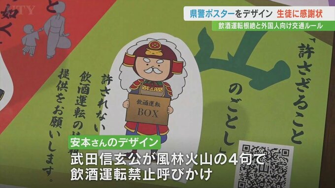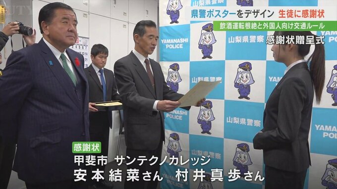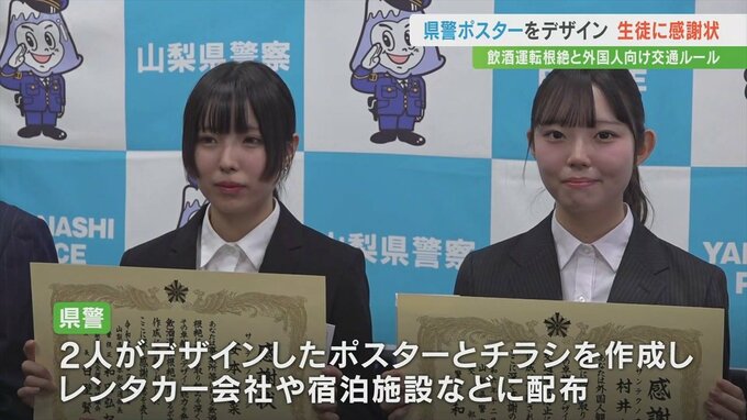 飲酒運転の根絶や外国人観光客に交通ルールを伝えるポスターをデザインした専門学校の生徒に山梨県警が感謝状を贈りました。