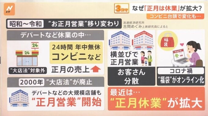 しかし、一気に営業を始めるので、横並びでお客さんが分散してしまうという状況になったそうです。さらに、コロナ禍で福袋がオンライン化したことなどもあり、最近は“正月休業”が拡大しているということです。