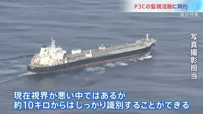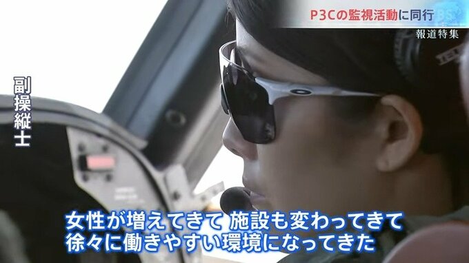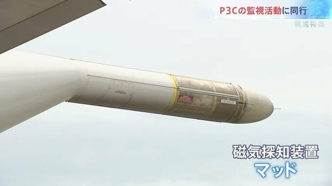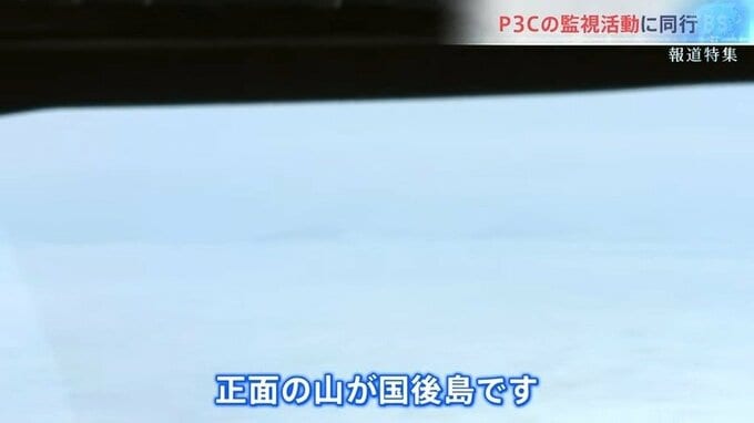 報道特集のカメラがP3Cに乗り込んだ。離陸後すぐに巡航速度、時速600キロに移った。1機で四国の面積をカバーし、10時間の飛行もある。9000メートルから海面すれすれまで緩急をつけての飛行が可能だ。