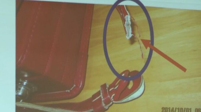 「事故当時のランドセルです。車体の下に体が入り込んでしまったので、本体自体は傷ぐらいで済んだのですが、事故の衝撃でランドセルの肩ひもがちぎれてしまいました」【画像⑤⑥】