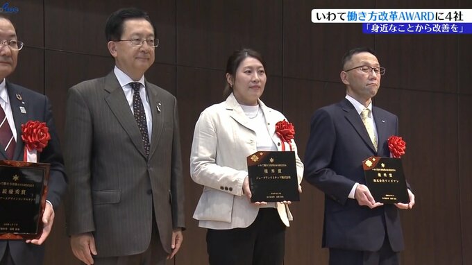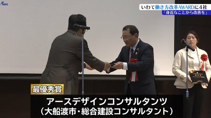 いわて働き方改革アワードは、2016年に始まった県の表彰制度で、今回は最優秀賞に大船渡市の総合建設コンサルタント会社「アースデザインコンサルタンツ」が選ばれました。