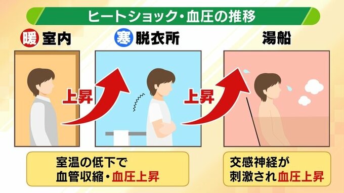 血圧が上がるパターンは2種類。まず、暖かいところから脱衣所へ行くと室温の低下で、血管が収縮し血圧が上昇します。もうひとつのパターンが湯船に入る瞬間です。あつい湯船に入ると、交感神経が刺激され、血圧が上昇します。