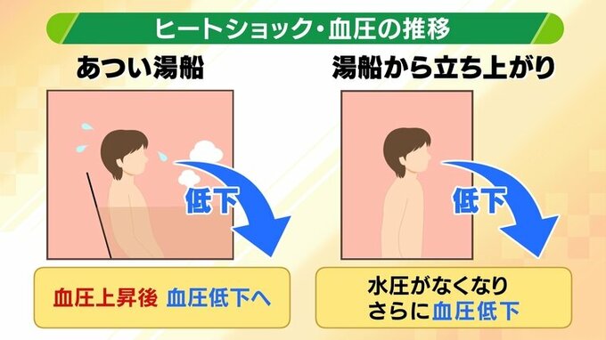 血圧が下がるパターンもあります。あつい湯船にずっと入っているとき、先ほどとは逆で、収縮していた血管が大きくなる、ということは圧力が下がり、血圧がどんどん低下していく。さらに怖いのが、お風呂から出るときです。湯船から立ち上がるだけで立ちくらみになる人もいると思いますが、浴槽の中では、微力ながら水圧がかかっているので、その水圧がなくなりさらに血圧が低下するのです。