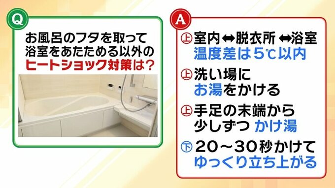 「お風呂のフタを取って浴槽を暖める」以外のヒートショック対策は、まず、室内・脱衣所・浴室の温度差を5度以内にすること。次に、洗い場に先にシャワーなどでお湯をかけること。そして、体を急激に温める・冷やすことがよくないため、手足の末端から少しづつかけ湯をすること。