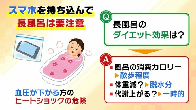 長風呂によるダイエット効果はあるのか?早坂教授によると、消費カロリーは散歩程度しかなく、体重が減るのは脱水分だということです。代謝が上がるのも一時的だといいます。つまり、早坂教授の見解では、長風呂のダイエット効果はあまりないということです。