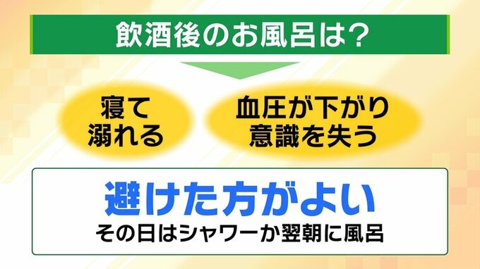 まず、飲酒後のお風呂は、寝て溺れてしまうリスクや、血圧が下がり意識を失う可能性があるため、避けた方がよいとのことです。その日はシャワーか翌朝にお風呂に入るのがいいでしょう。どうしてもお風呂に入りたい場合は、家に人がいる場合は誰かに伝えておく、人がいない場合は、携帯電話でアラームをかけるなど、寝るかもしれないという前提でいるといいかもしれません。