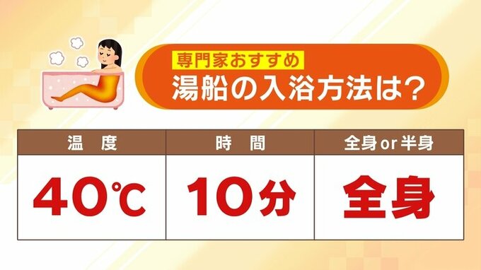 最後に、早坂教授おすすめの湯船の入浴方法を聞きました。温度は40℃前後、湯船に浸かる時間は約10分。温まり方は個人差がありますが、ちょうどいいのは体温が0.5℃~1℃上がるくらい。目安は額に汗が出始めるくらいだそうです。そして半身浴よりも全身つかる方がおすすめだということです。
